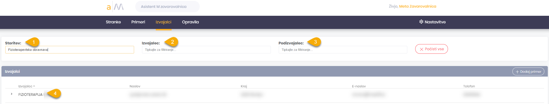 Ustreznega izvajalca poiščemo tako, da v iskalna polja vpišemo eno od iskalnih vrednosti, ki so lahko Storitev (1), Izvajalec (2) ali Podizvajalec (3). Nabor izvajalcev se bo nato skrčil skladno z vpisanim podatkom (4).