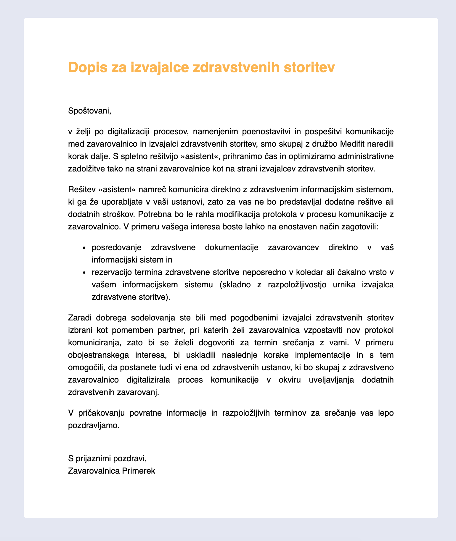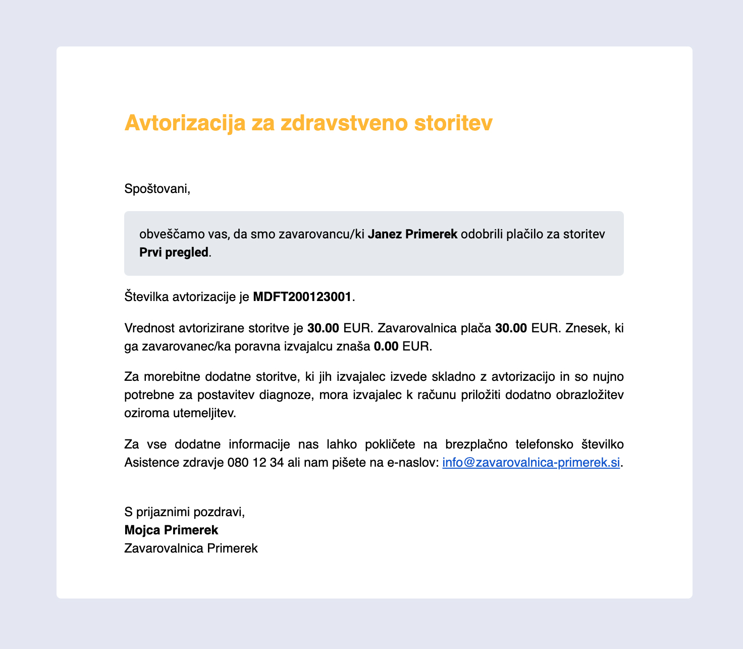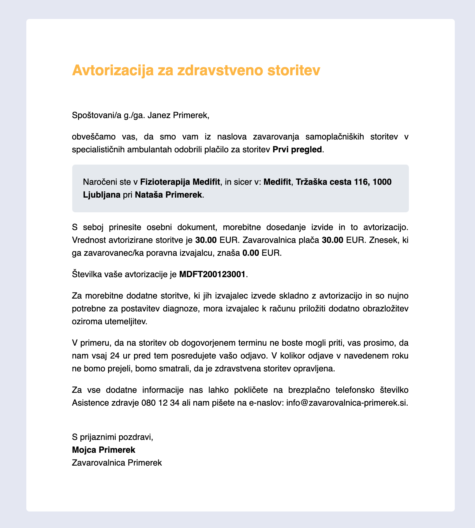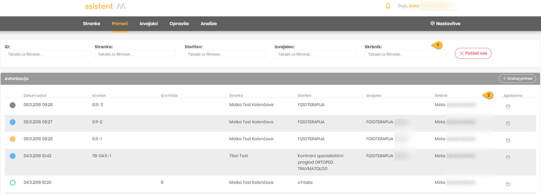 Seznam avtorizacij je prikazan na zavihku Primeri skupaj z izdanimi eTriažami. Na seznamu vseh primerov lahko poiščemo avtorizacijo tako, da v iskalno polje vpišemo ključno besedo ali številko ID. Filtriramo (1) jih lahko glede na ID številko, ime stranke, storitev, izvajalca ali skrbnika. Nabor rezultatov je nato skrčen glede na vpisani iskalni niz. S klikom na vrh posameznega stolpca (2) jih lahko razvrstimo po imenu stranke, datumu ustvarjenega primera ali ostalih podrobnostih.