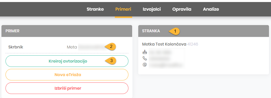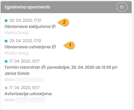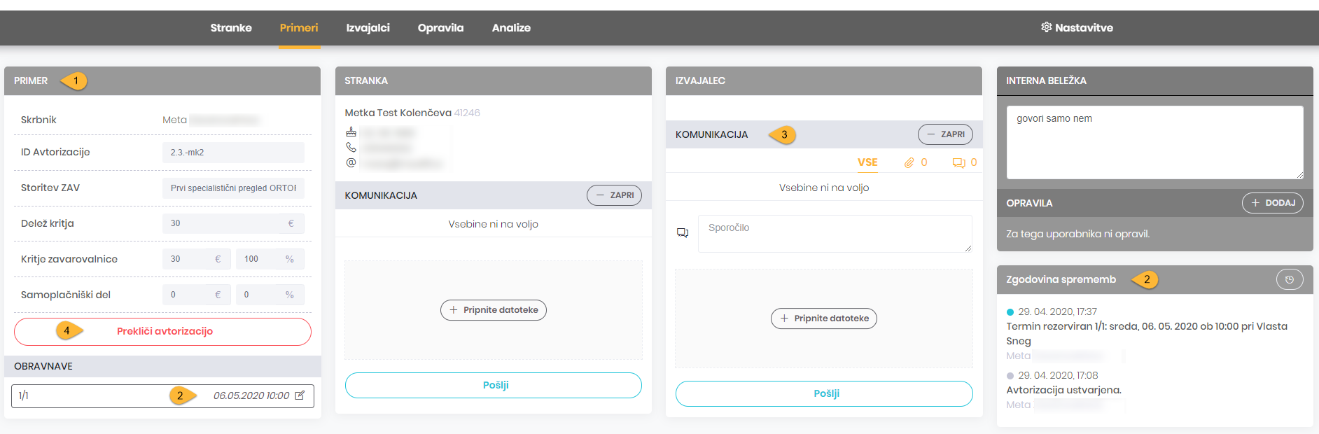Po potrditvi termina se ta zabeleži pri izbranem izvajalcu, sami pa lahko dostopamo do vseh informacij na enem mestu: podatkov o avtorizaciji (1) in izbranem terminu (2), ki se nam izpišejo tudi v zgodovini sprememb (2). Izvajalcu lahko po potrebi pošljemo tudi komentar ali datoteko (3).