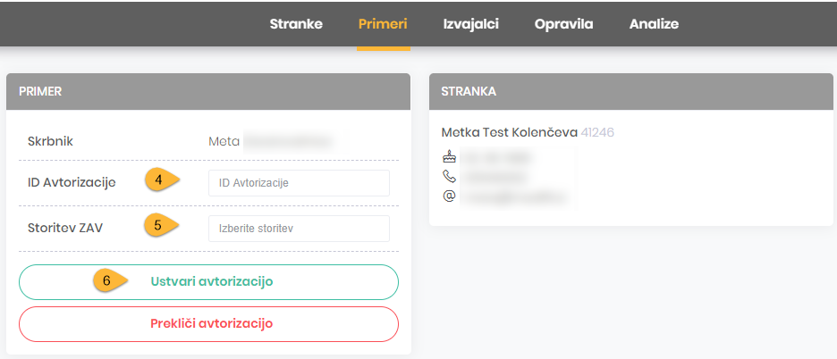 S klikom na kreiraj avtorizacijo (3) se nam odpre novo okno, kamor vpišemo ID avtorizacije (4) in izberemo želeno storitev (5). Nato ustvarimo avtorizacijo (6) in nadaljujemo z izbiro izvajalca (7) in prostega termina.