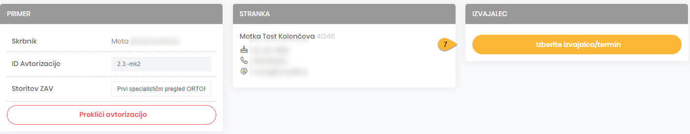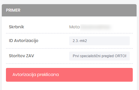 V določenih primerih lahko avtorizacijo tudi prekličemo (4). V tem primeru se bo termin izbrisal z urnika pri izbranem izvajalcu, v našem sistemu pa bo to ustrezno zabeleženo. Termin lahko izbriše tudi izvajalec, o čemer nas sistem avtomatsko obvesti.