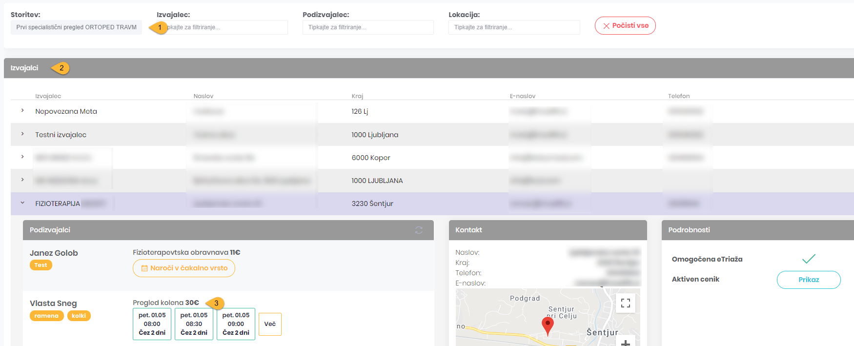 Na podlagi prej izbrane storitve (1) nam sistem prikaže vse izvajalce (2), ki to storitev opravljajo. S klikom na izvajalca se nam prikaže seznam podizvajalcev (zdravnikov specialistov) in njihovih prostih terminov ali možnost naročanja v čakalno vrsto izvajalca, ki so nam na voljo za rezervacijo. Poleg tega lahko vidimo tudi poimenovanje storitve pri izvajalcu ter ceno (3).