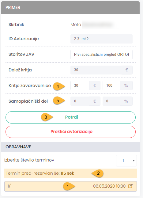 S klikom na želeni termin se nam odpre nov pogled z informacijami o izbranem terminu (1) in odštevalnikom časa (2). Termin je namreč rezerviran le 120 sekund. V tem času moramo termin potrditi (3), saj se v nasprotnem primeru sprosti in postane na voljo drugim uporabnikom. Vidimo tudi ceno storitve, ki predstavlja celoten delež kritja avtorizacije, pri čemer lahko po potrebi urejamo znesek, ki ga krije zavarovalnica (4), kar posledično vpliva in ustrezno preračuna tudi za samoplačniški del kritja (5).