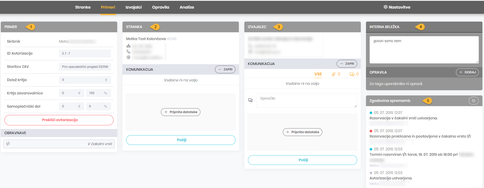 S klikom na posamezno avtorizacijo se nam prikaže celoten pregled podrobnosti – kartica avtorizacije: podatki o dotični avtorizaciji (1), podatki stranke (2), podatki in komunikacija z izvajalcem (3), interna beležka in opravila (4), ki so vezana na dotično stranko ter zgodovina sprememb (5) te avtorizacije.