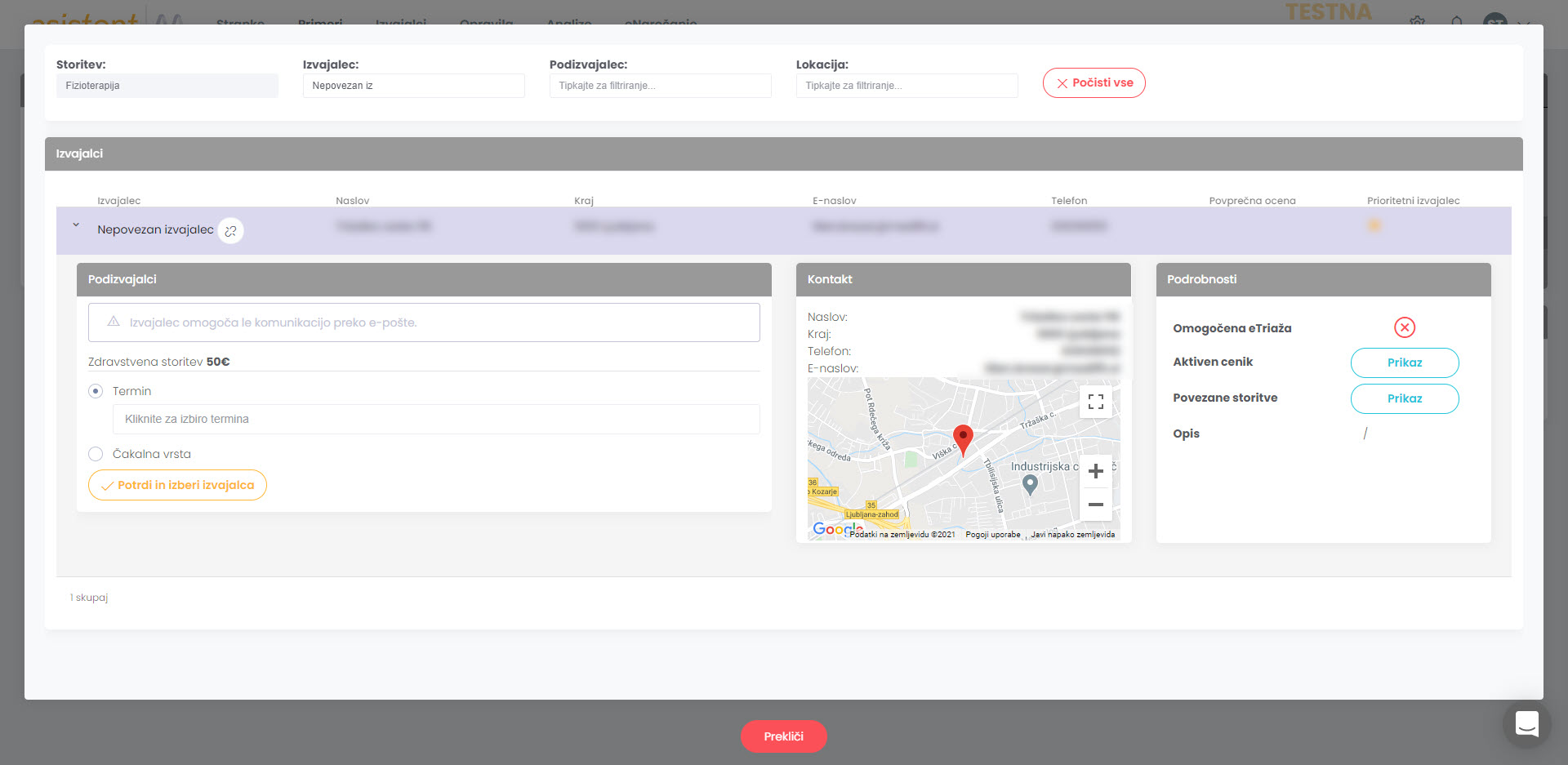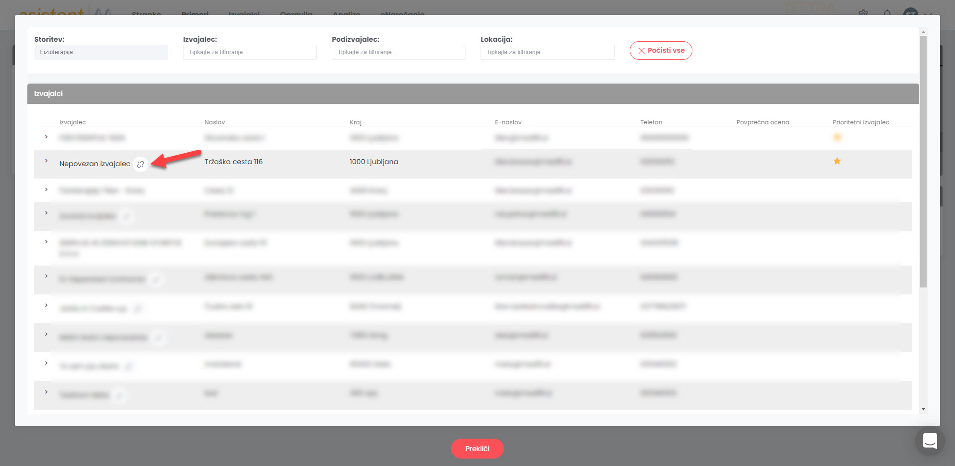 Avtorizacija se kreira na enak način kot pri naročanju direktnega termina k povezanemu izvajalcu. Ob izbiri izvajalca so nepovezani izvajalci označeni s posebno ikono.
