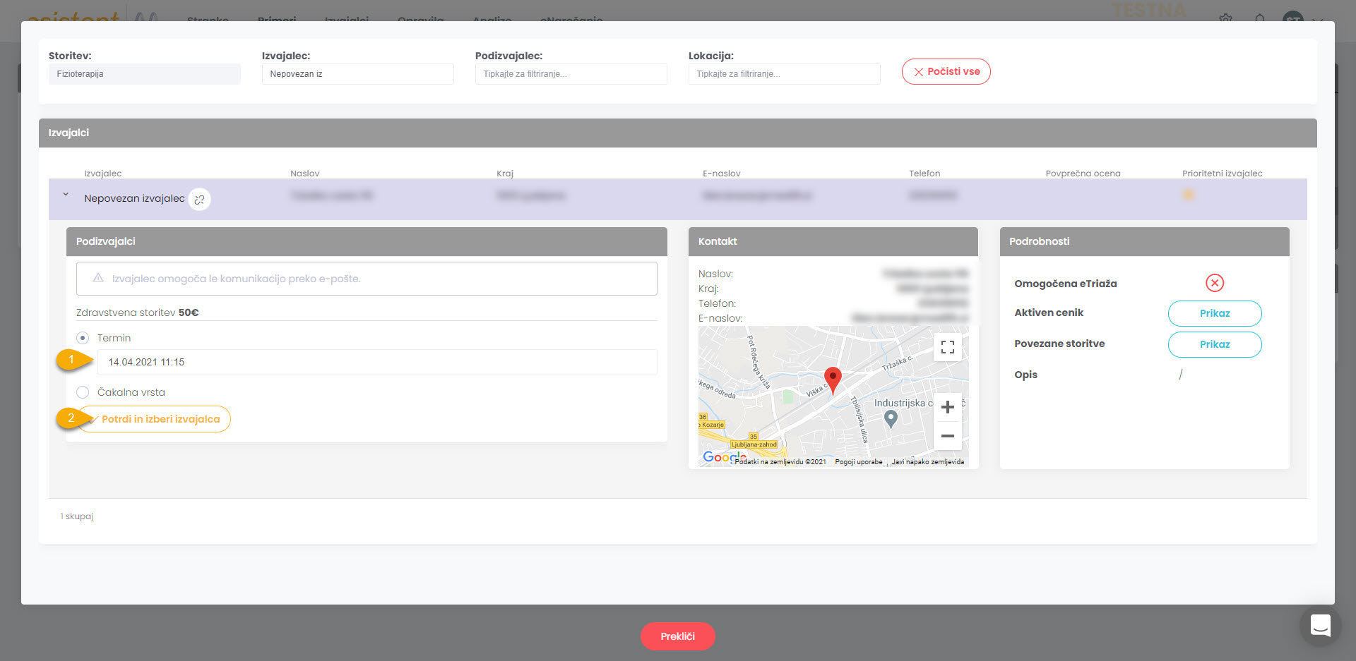 Če izberemo naročanje na direktni termin, se moramo za termin najprej dogovoriti z izvajalcem, potem pa lahko nastavimo točen čas termina (1) in ga potrdimo (2).