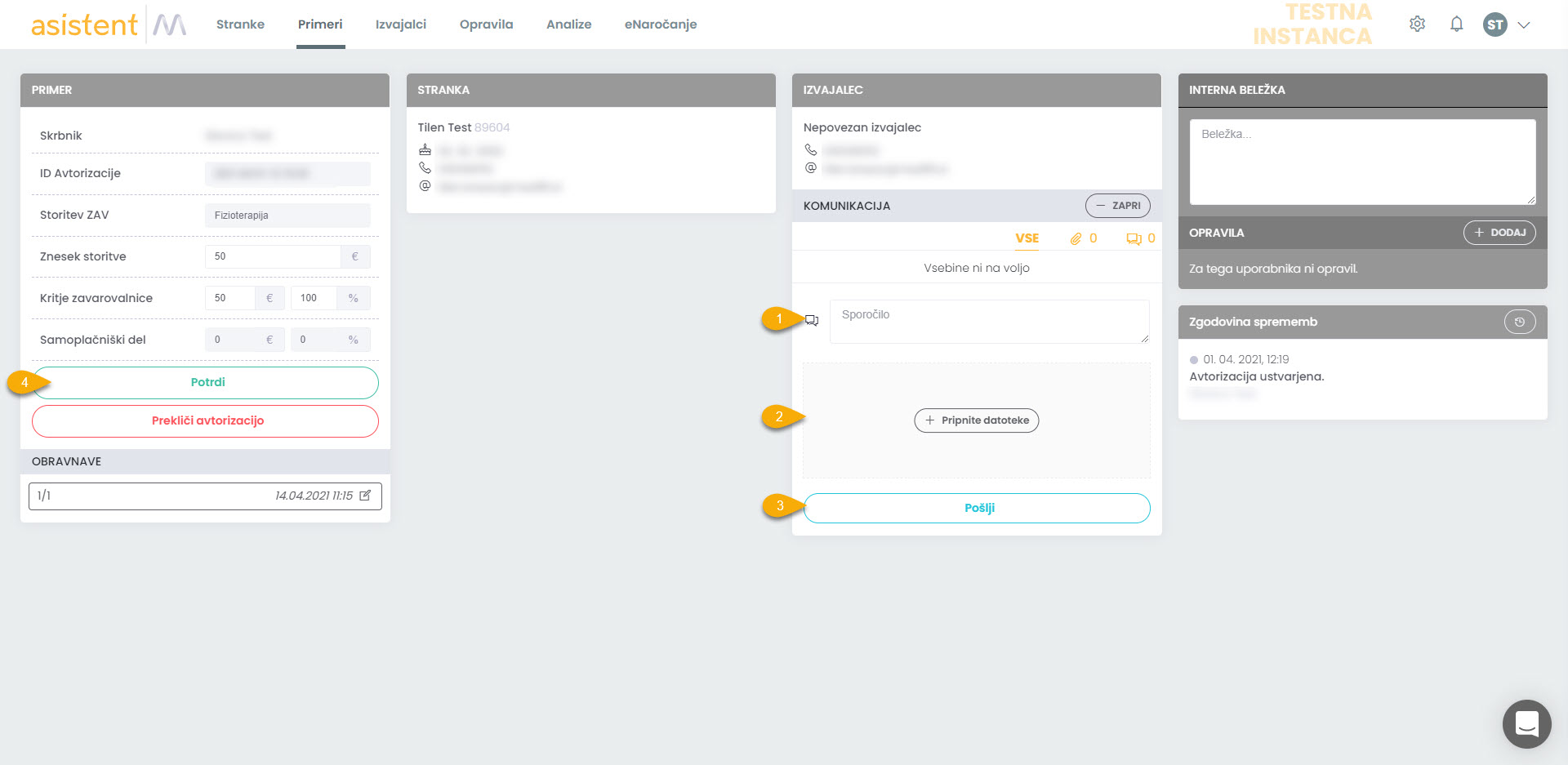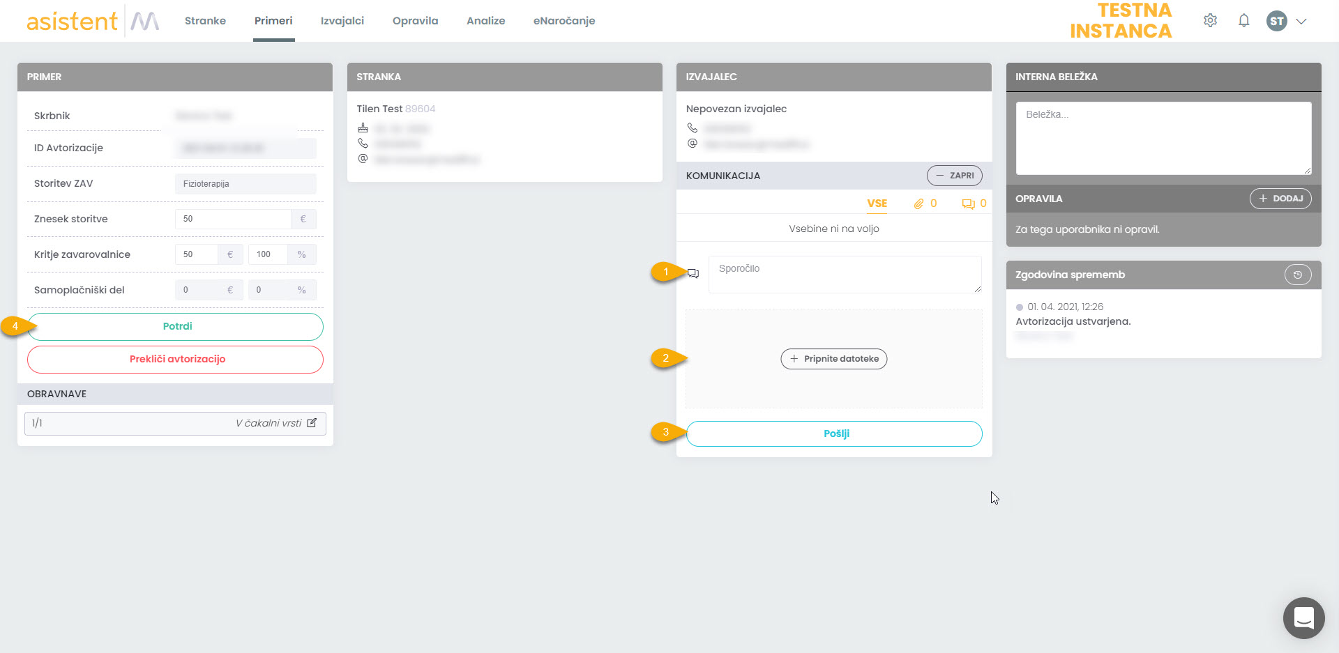 Enako kot pri naročanju na direktni termin, lahko izvajalcu napišemo sporočilo (1), pripnemo razno dokumentacijo, ki se nanaša na avtorizacijo (2) in kliknemo na gumb Pošlji (3), da se komentar in dokumenti pripnejo na avtorizacijo. Na koncu pa avtorizacijo še potrdimo (4).