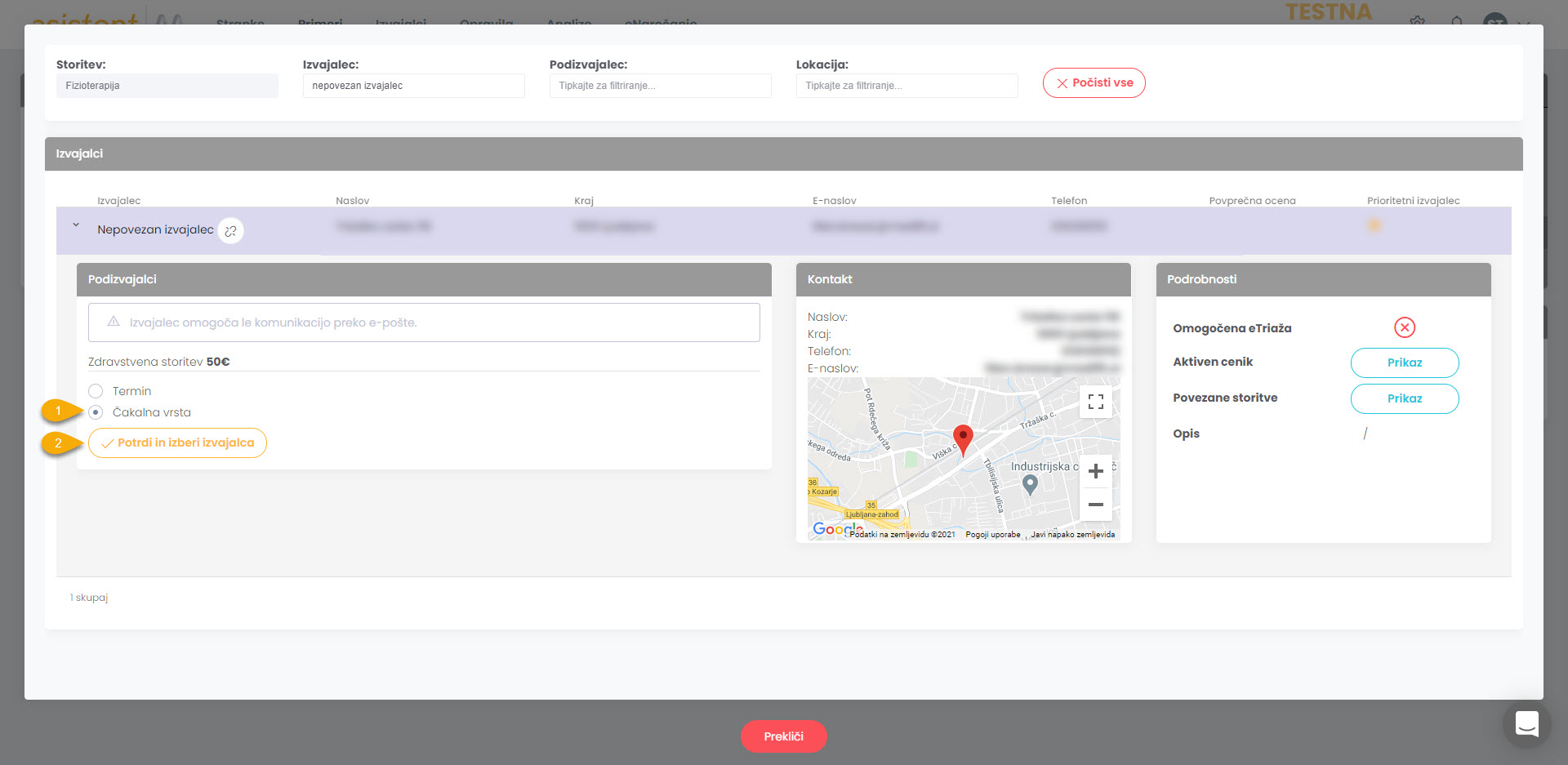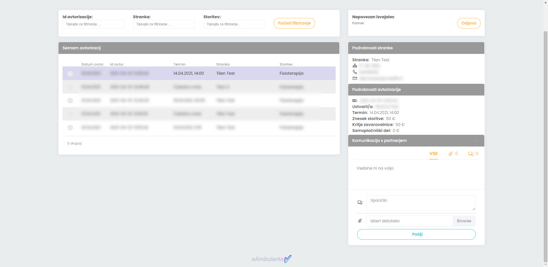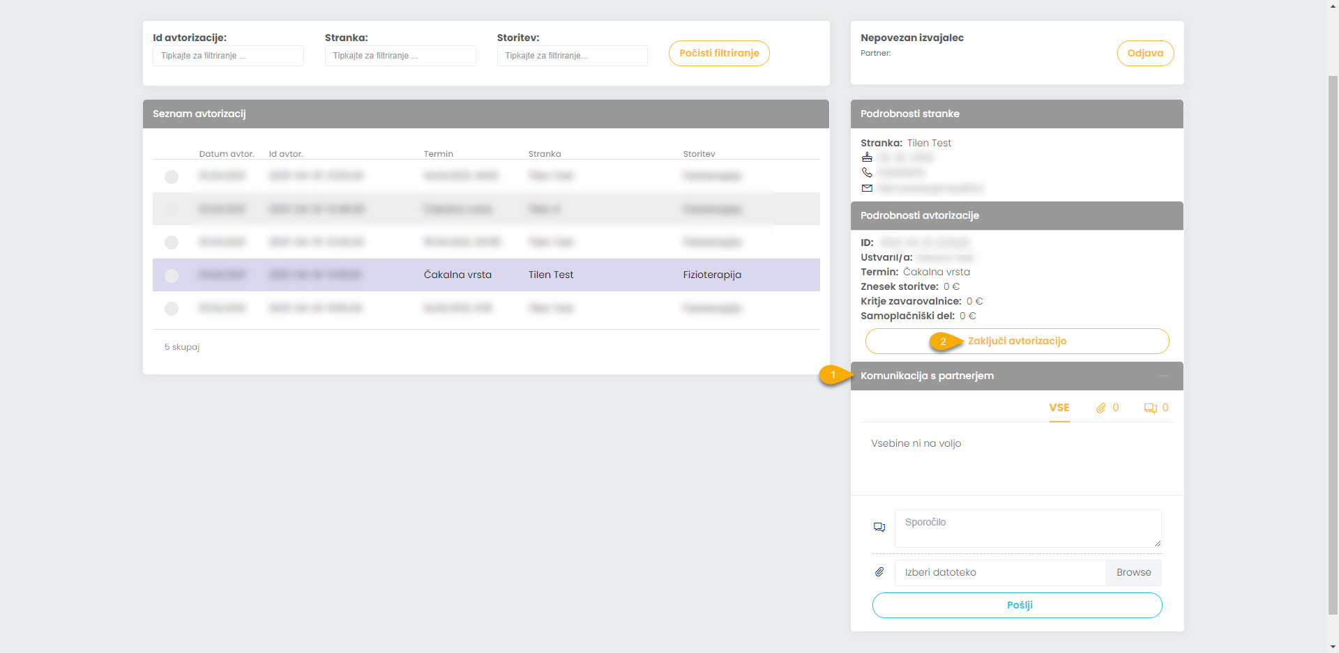 Ko je avtorizacija potrjena, izvajalec na svoj e-poštni naslov prejme obvestilo, da je bila ustvarjena avtorizacija v čakalni vrsti, ter povezavo prek katere se lahko vpiše v svoj vmesnik za nepovezane. Pri naročilu v čakalno vrsto, izvajalec sam kontaktira stranko in se dogovori za termin. Datum točnega termina vam lahko pošlje kot komentar v zavihku Komunikacija s partnerjem (1). Po zaključeni obravnavi pa izvajalec prek Komunikacije s partnerjem pošlje še kakršnokoli relevantno dokumentacijo, ter klikne gumb Zaključi avtorizacijo (2), da se ta status prepiše v asistenta.