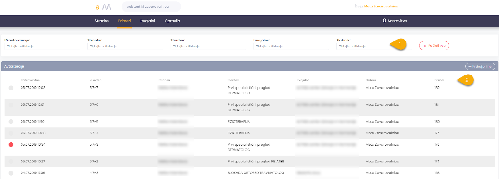 Na seznamu vseh primerov lahko poiščemo določeno eTriažo tako, da v iskalno polje vpišemo ključno besedo ali številko ID. Filtriramo (1) jih lahko glede na ID številko, ime stranke, storitev, izvajalca ali skrbnika. Nabor rezultatov bo skrčen glede na vpisani iskalni niz. S klikom na vrh posameznega stolpca (2) jih lahko razvrstimo po imenu stranke, datumu ustvarjenega primera in ostalih podrobnosti.