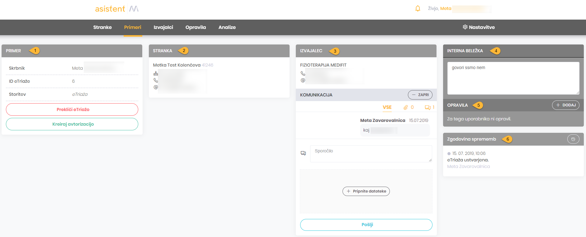 S klikom na posamezno eTriažo se nam odpre celoten pregled podrobnosti: podatki o dotični eTriaži (1), podatki stranke (2), podatki in komunikacija z izvajalcem (3), interna beležka in opravila (4), ki so vezana na dotično stranko ter zgodovina sprememb (5) te eTriaže.