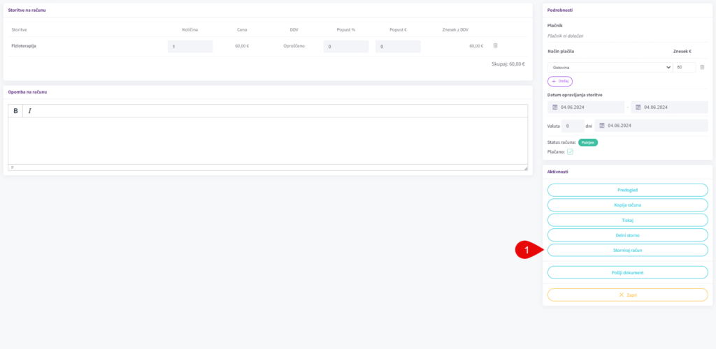 Stornirate lahko tako navadne račune, kot tudi zbirne račune. Račun, ki ga želite stornirati odprete in ga stornirate s klikom na “Storniraj račun” (1). Pojavilo se vam bo okno kjer še enkrat potrdite, da želite račun stornirati.