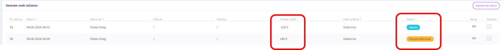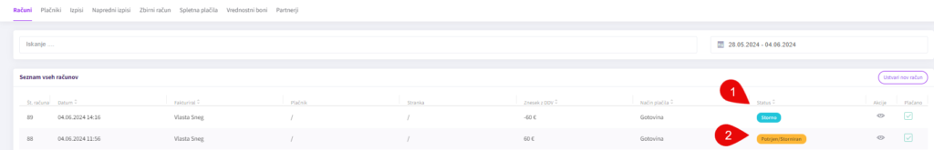 Originalen račun bo viden pod “Računi” z oznako “Potrjen/Storniran” (1), storno računa pa bo negativnem znesku viden pod oznako “Storno”(2).