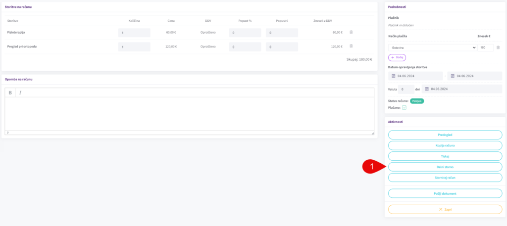 Račun, ki ga želite delno stornirati odprete in s klikom na “Delni storno” (1) stornirate. Pojavilo se vam bo okno kjer še enkrat potrdite, da želite račun delno stornirati stornirati.