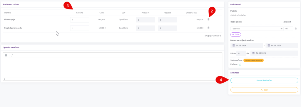 Iz računa izbrišite postavke za storitve/produkte (2) ki so bile opravljene/prodane ali pa samo spremenite količino za število opravljenih storitev (3).
