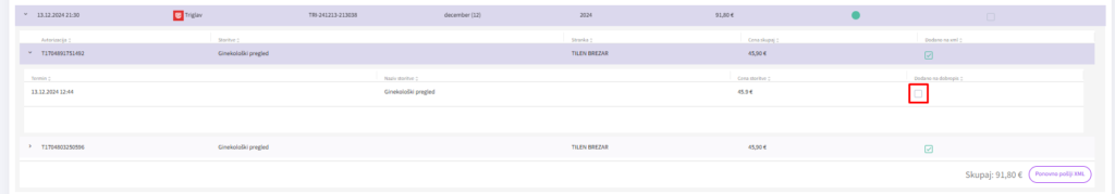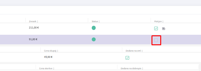 Dobropis lahko izdate za eno ali več postavk na XML računu. Pogoj, da lahko izdate dobropis zavarovalnici pa je ta, da račun ni potrjen. Zato morate v vrstici “Potrjen” odstraniti kljukico, če je le-ta označevala polje.