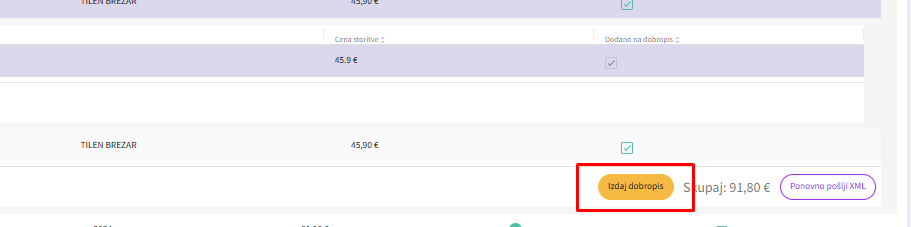 Ko označite postavke, za katere želite izdati dobropis, ga lahko izdate s klikom na gumb “Izdaj dobropis“.