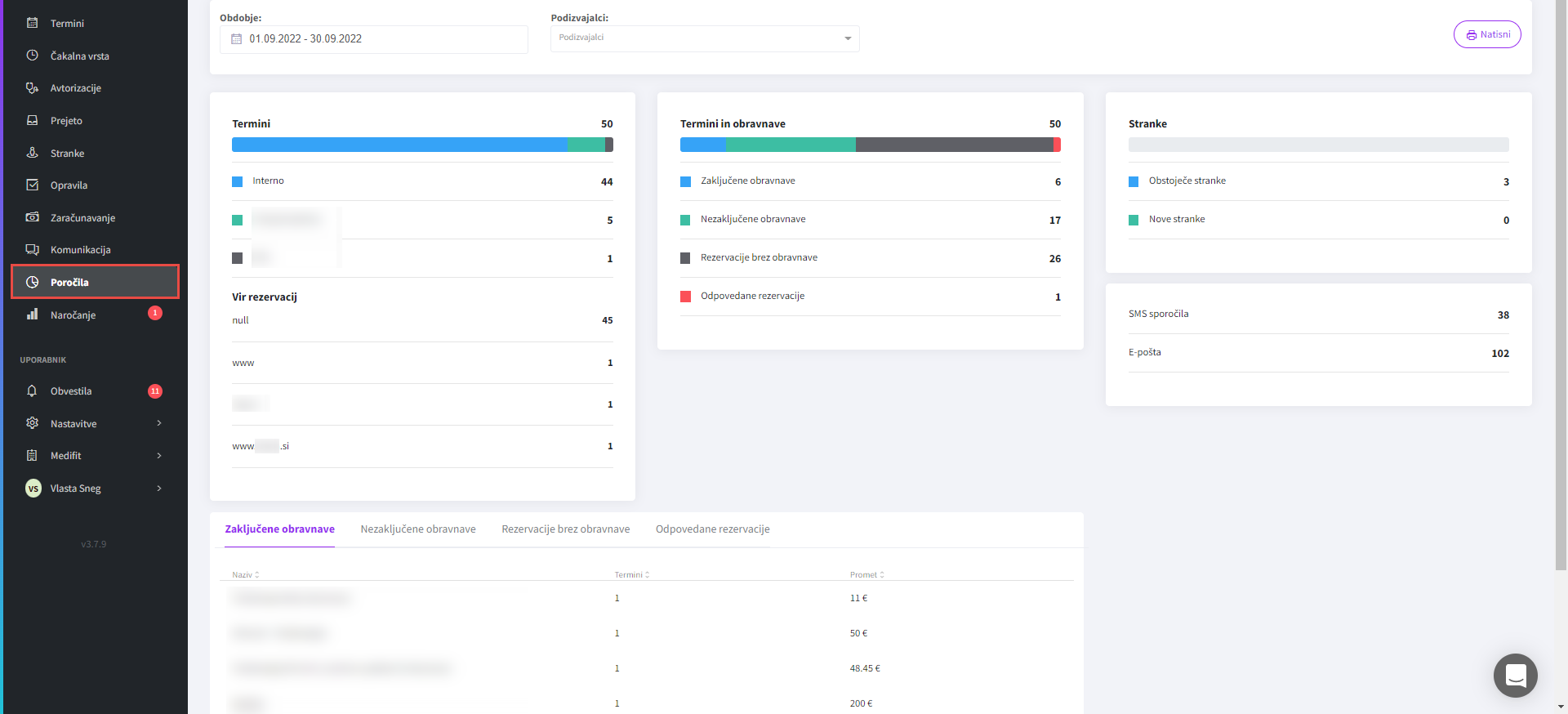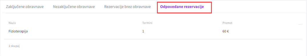 - Odpovedane rezervacije: seštevek obravnav, ki so bile odpovedane.