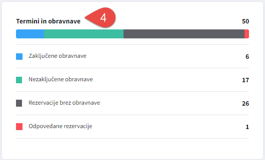 V zavihku Termini in obravnave(4) je prikazan števec, ki predstavlja skupno število obravnav in terminov, ki so se zgodile v izbranem obdobju. Če je vključen tudi tekoči dan, se lahko prikažejo termini, ki so na koledarju vneseni, vendar jim še ni bil določen status (zaključena obravnava, nezaključena obravnava, rezervacije brez obravnave in odpovedana rezervacija).