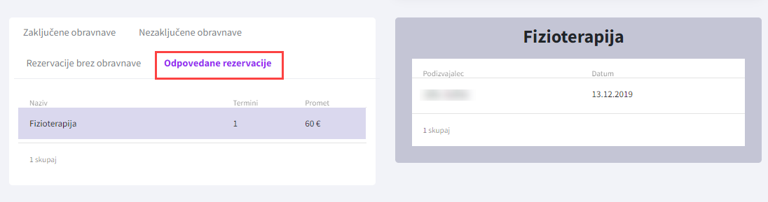 S klikom na posamezno kategorijo (npr. Odpovedane rezervacije) se prikaže seznam obravnav, ki spadajo v izbrano kategorijo. S klikom na obravnavo se prikažejo podrobnosti, s ponovnim klikom pa se nam odpre kartica termina.