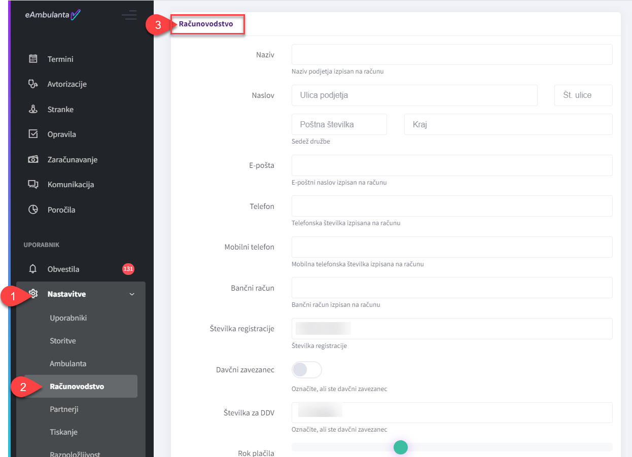V “Nastavitvah” (1) se bo prikazal meni “Računovodstvo” (2), kamor vpišete podatke, ki so potrebni za uspešno poslan račun XML: