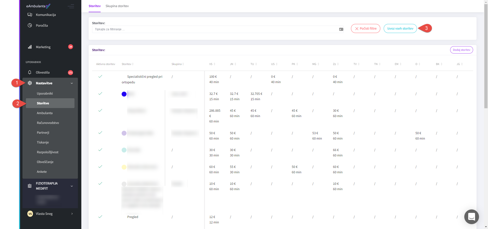 Če zavarovalnica od vas zahteva šifre vseh storitev, ki jih imate vnesene v eAmbulanti (tudi tiste, ki sicer niso dodane na aktivnem ceniku), jih izvozite tako, da izberete “Nastavitve” (1) in nato “Storitve” (2) ter “Izvoz vseh storitev” (3).