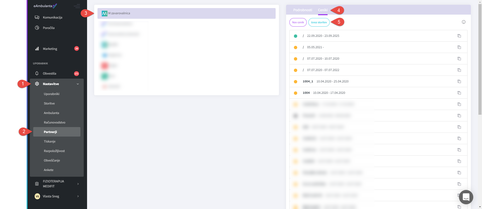 Če zavarovalnica od vas zahteva zgolj šifre storitev iz aktivnega cenika, jih izvozite tako, da v “Nastavitvah” (1) najprej izberete “Partnerji (2) in nato s seznama želeno zavarovalnico (3). V zavihku “Ceniki” (4) nato kliknete na “Izvoz storitev” (5), s čimer se izvozijo vse storitve z aktivnega cenika za to zavarovalnico.
