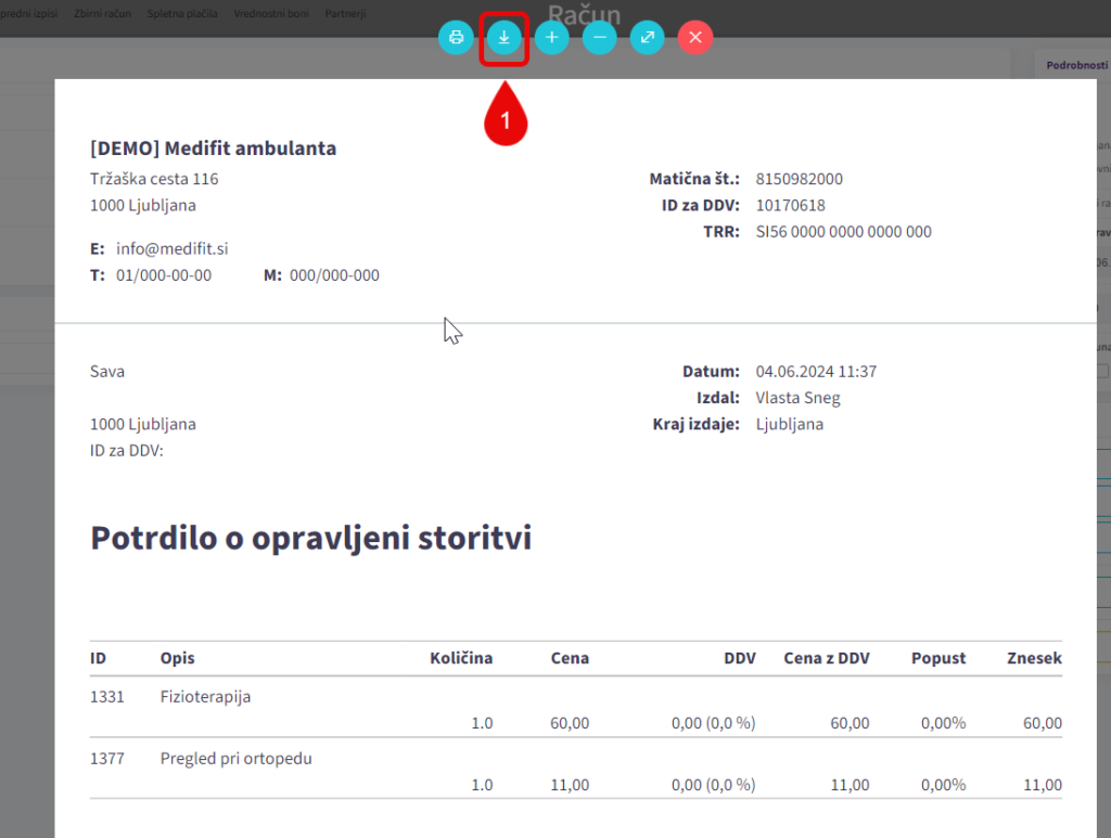 Ko račun v kreirate, se vam odpre predogled računa, ki ga lahko v pdf. obliki prenesete tako, da kliknete ikono za prenos datoteke (1).
