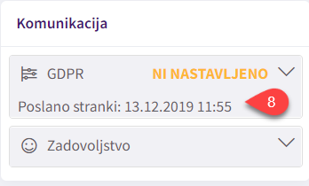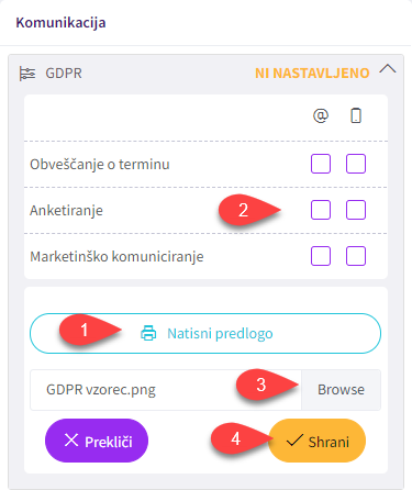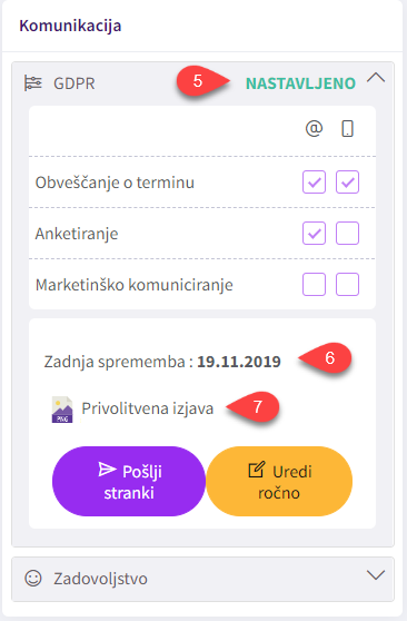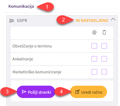V pogledu stranke poiščemo polje Nastavitve komunikacije (1). Kadar stranka nima urejenega soglasja je polje označeno z rumeno – Ni nastavljeno (2). V kolikor nam je stranka zaupala svoj e-poštni naslov, lahko obrazec pošljemo elektronsko, s klikom na gumb Pošlji stranki (3). Polja se bodo po rešenem obrazcu odkljukala avtomatsko. Če pa stranka želi izpolniti obrazec v fizični obliki, lahko le tega uredimo ročno, s klikom na gumb Uredi ročno (4).
