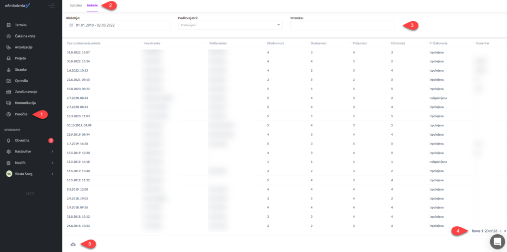 V eAmbulanti je omogočen pregled rezultatov anket o zadovoljstvu, ki se strankam pošiljajo skladno z vašimi nastavitvami (“Nastavitve”, “Obveščanje”, “Anketa”) in GDPR privolitvami, ki jih je podala stranka.