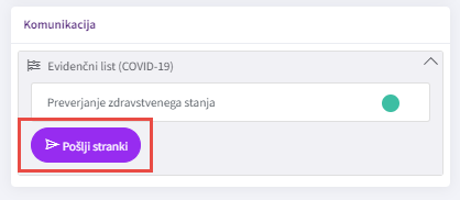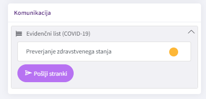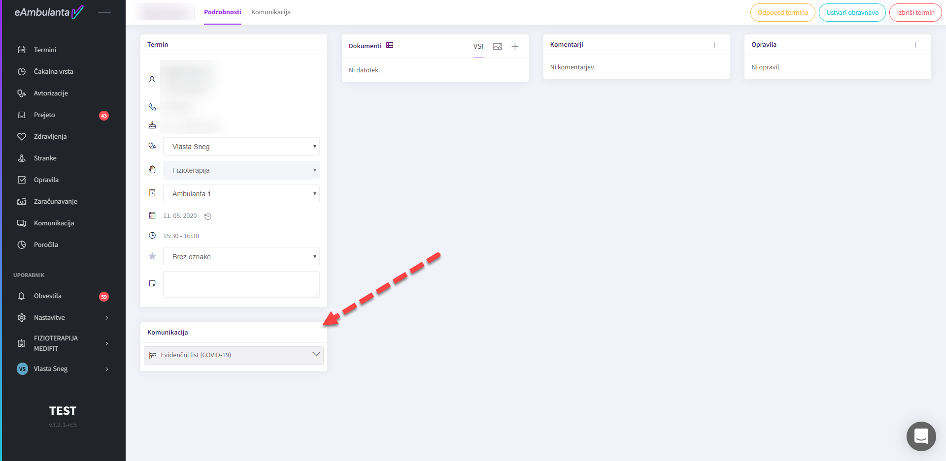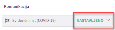 • S klikom na rezerviran termin odpremo polje Komunikacija – Evidenčni list (COVID-19).