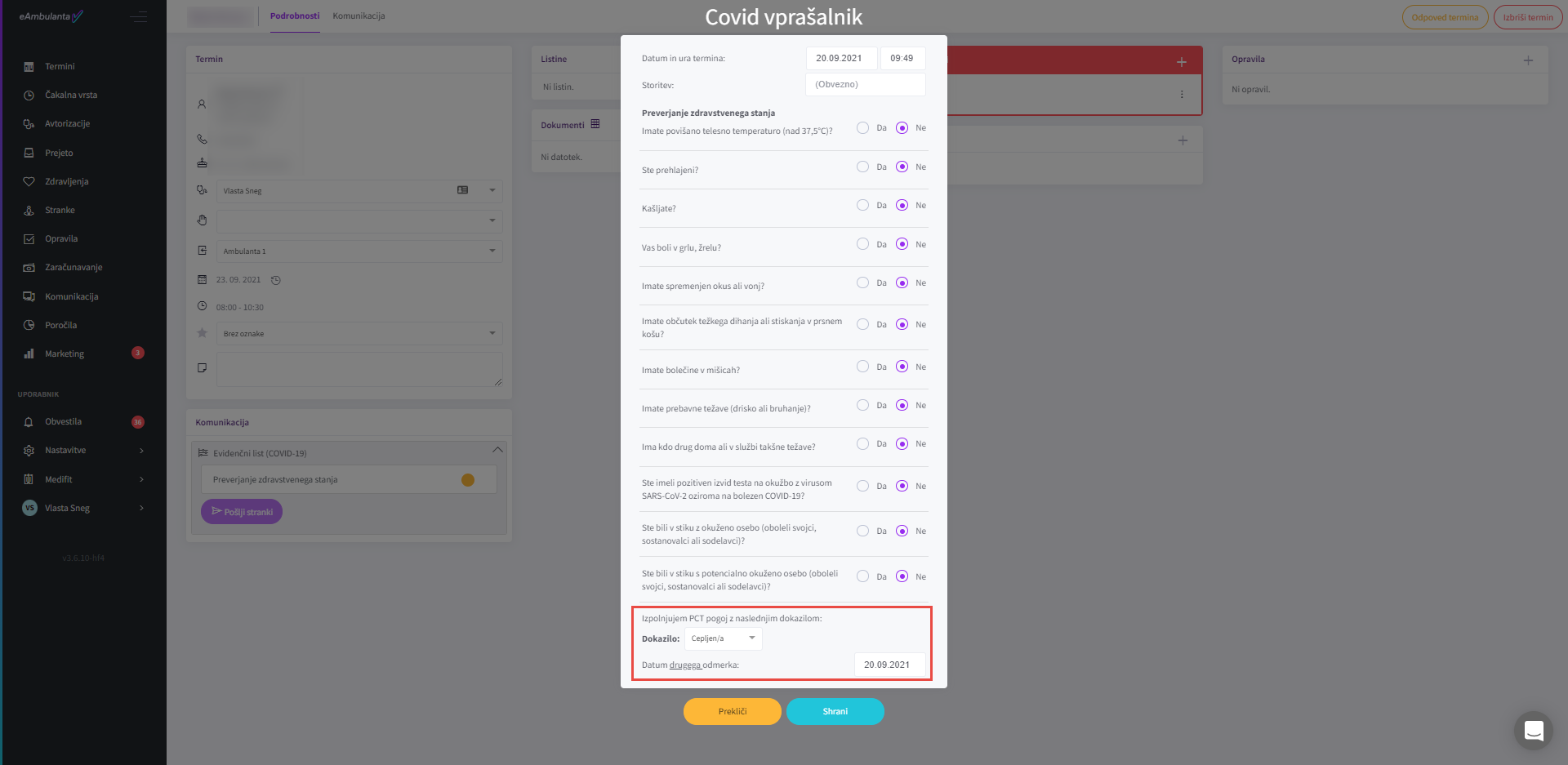S klikom na vprašalnik, se le-ta odpre v novem okencu. Najprej določite datum in uro termina, ki ju lahko ročno prilagodite s klikom na polje za datum ali uro. Vprašalnik nato izpolnite s kliki na ustrezna polja (Da, Ne). Na koncu je potrebno izbrati še vrsto dokazila za izpolnjevanje pogoja PCT. Pri tem lahko izbirate med: