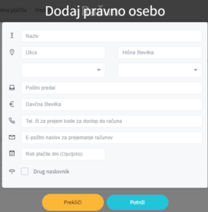 Po tem, ko izpolnite vsa zahtevana polja, novo pravno osebo shranite s klikom na “Potrdi”.