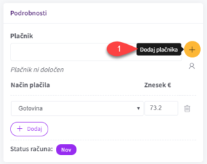 V urniku na kartici obravnave, pod zavihkom “Storitve”, najprej izberete “Nov račun”. Avtomatsko se bo izpisala storitev, ki je bila avtorizirana. Storitve lahko poljubno spremenite, dodate ter jim določite morebitni popust. Storitve dodate na zbirni račun tako, da najprej določite plačnika (zavarovalnico, ki ji račun izdajate). Plačnika lahko poiščete iz spustnega seznama ali ga dodate s klikom na “Dodaj plačnika” (1).