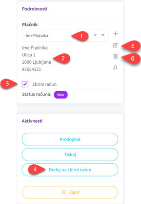 Pri kasnejših vnosih lahko med shranjenimi pravnimi osebami izbirate v vrstici “Plačnik” (1). Podatke izbranega plačnika (2) lahko urejate (5) ali izbrišete (6) s klikom na označene ikone. Ko obkljukate “Zbirni račun” (3),boste lahko izbrali akcijo “Dodaj na zbirni račun” (4).
