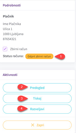 Status računa se bo spremenil v “Odprt zbirni račun” (1). S tem je bila postavka dodana na zbirni račun, ki ga boste nato kreirali skladno z navodili spodaj.