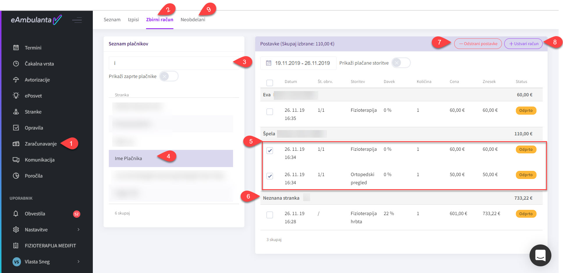 Na seznamu desno so storitve sortirane po stranki, za katero smo storitev opravili (5). V polju z odprtimi postavkami (5) lahko odkljukate želene postavke, jih kasneje odstranimo (7) ali iz izbranih ustvarimo račun (8).
