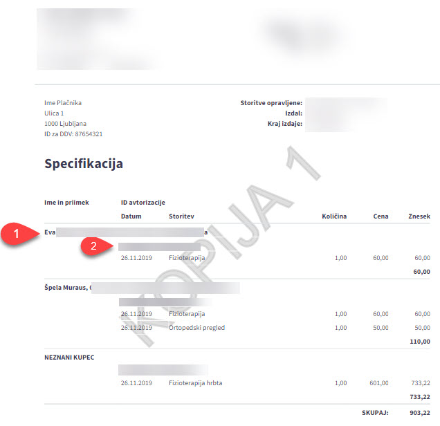 Podatki so ločeni po strankah (1) ter številkah avtorizacije (2).
